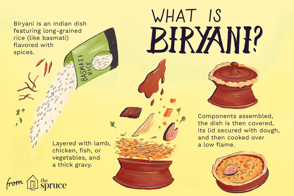 Biryani is a fragrant, spiced, rice-based dish popular throughout South Asia, consisting of layers of marinated meat (or vegetables), rice, and spices, slow-cooked together in a sealed pot using the dum pukht (slow steaming) method. Originating from Persia, it gained popularity in India during the Mughal era and has since diversified into countless regional variations across India, Pakistan, and beyond. Its rich, complex flavors, achieved with aromatic spices like cumin, cardamom, and saffron, make it a treasured and sometimes celebratory meal, often served with raita or salad.